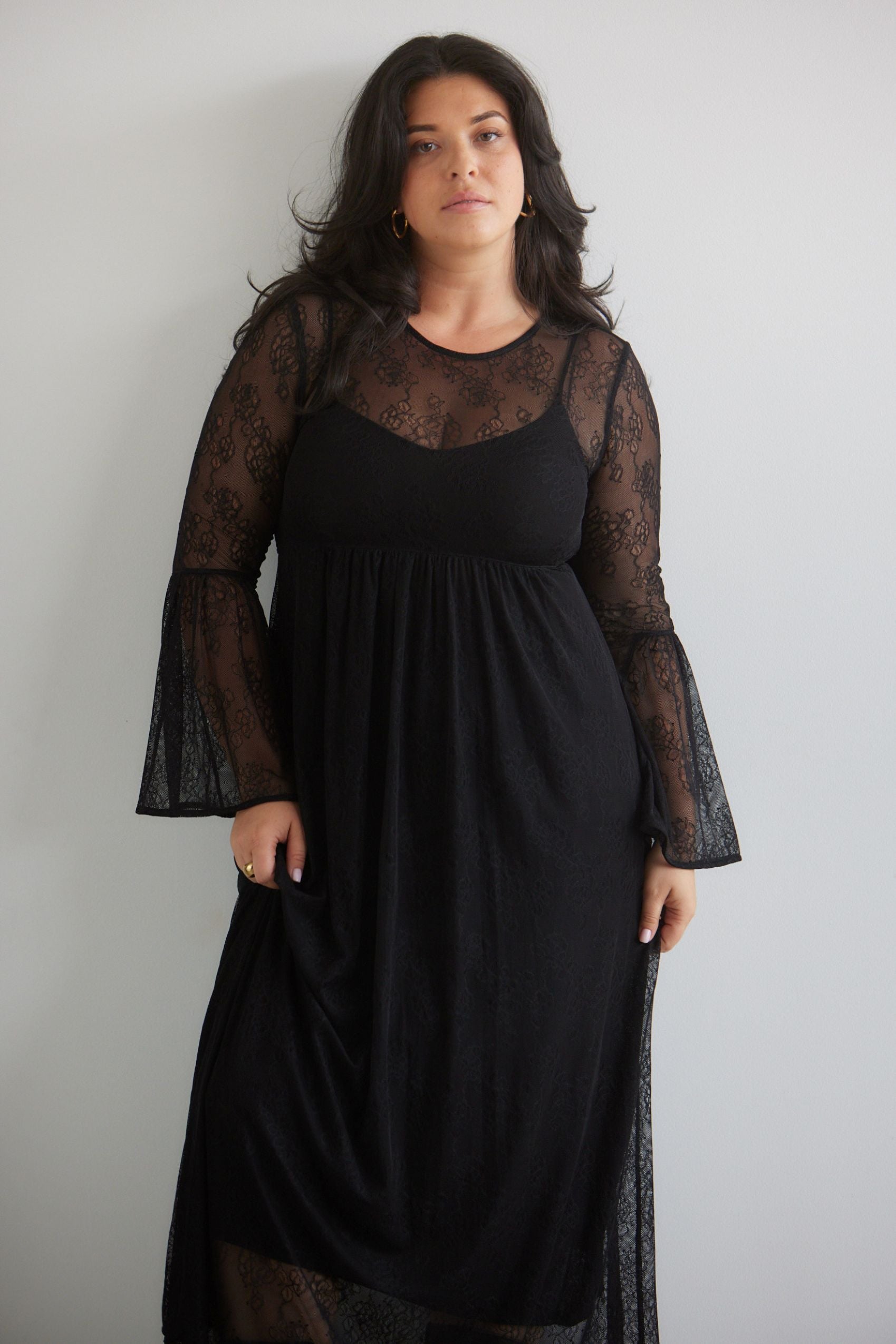 Delicate lace, sheer sleeves, and an easy empire cut — balanced with subtle stretch and a sleek slip for comfort.